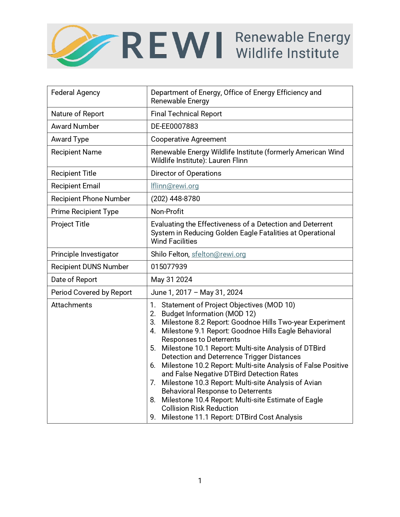 Los sistemas DTBird® fueron evaluados por el Renewable Energy Wildlife Institute (REWI) en dos parques eólicos: Manzana (California) y Goodnoe Hills (Washington) para medir la eficacia de detección y disuasión en grandes rapaces, especialmente águilas reales y calvas. El informe técnico de REWI, financiado por el Departamento de Energía de EE. UU. y apoyado por ... El sistema DTBird® demuestra su eficacia para reducir el riesgo de colisión de águilas y rapaces en parques eólicos: Principales conclusiones del informe técnico del REWI