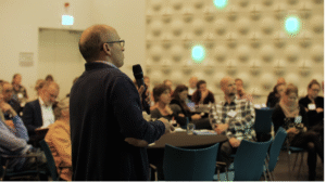 Agustín Riopérez (DTBird) giving his presentation and answering questions at the Symposium Wind and Nature, Flevoland, The Netherlands, 2019.